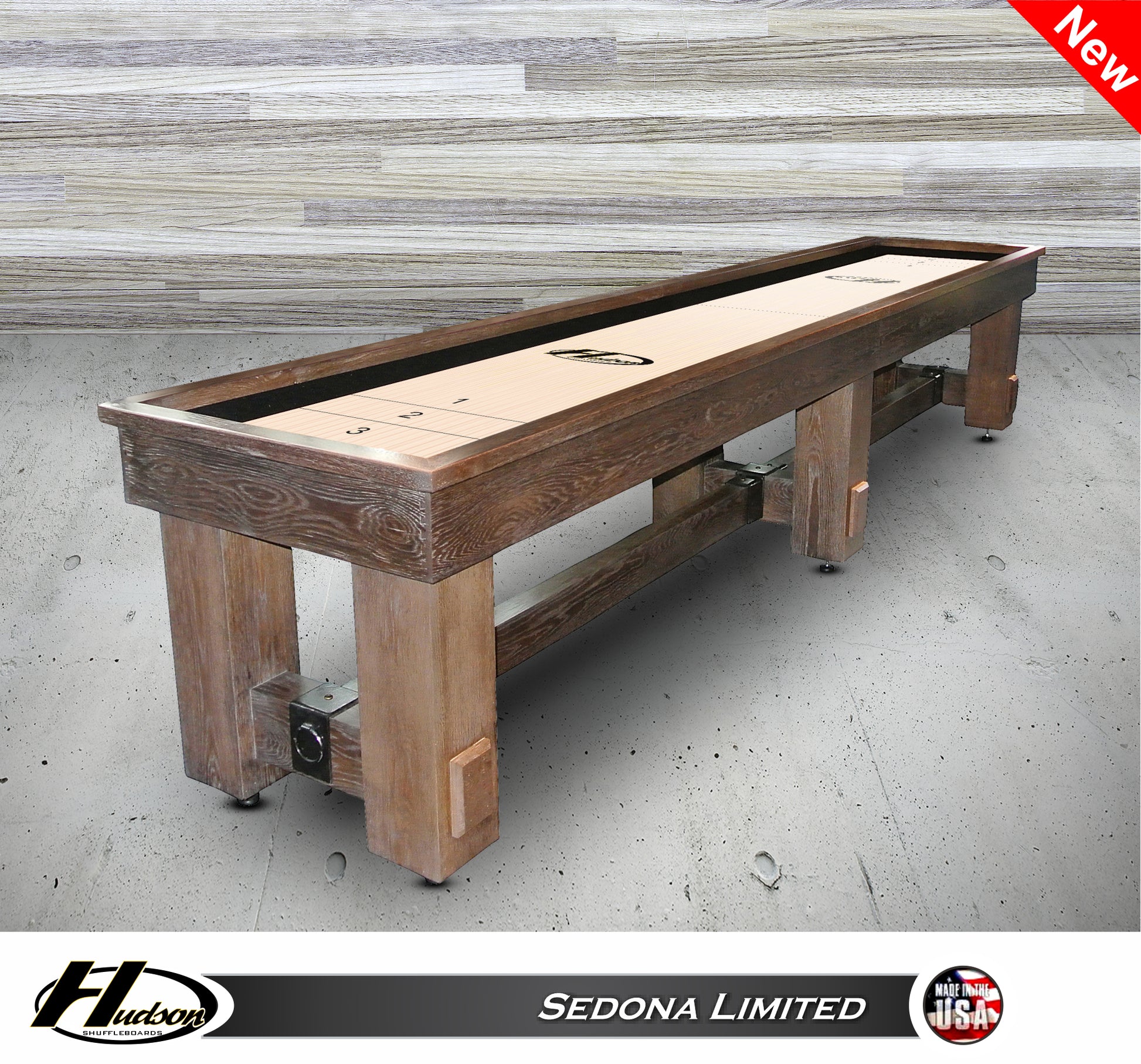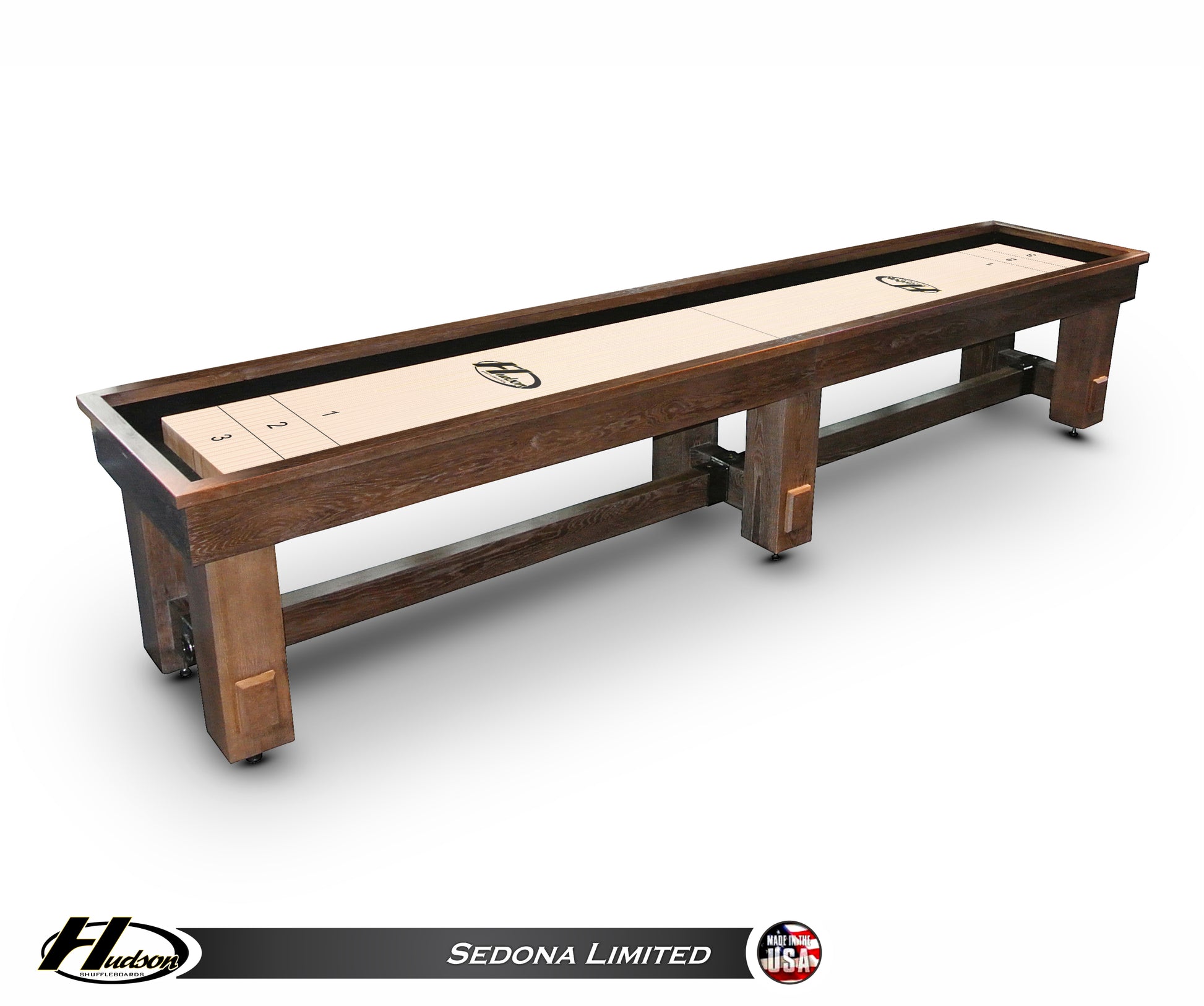New from Hudson Shuffleboards, the Sedona Limited Shuffleboard features a rustic look with hand-distressed legs and cradle. The cushions inside each end of the cradle are wrapped in your color choice of genuine leather. Constructed entirely of solid white oak (no veneers) and made to order, this newest addition to our collection is sure to be the showpiece in any room. The playing surface is constructed of select kiln-dried Hard Rock Maple and topped with our Polymer Finish (lifetime warranty). This is the same finish insisted upon by the Professionals in tournament play. And to help keep the playing surface true, climatic adjusters are included.