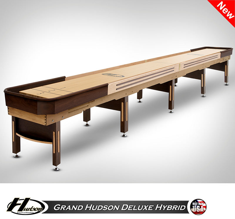 Join the Pros and enjoy playing shuffleboard on a beautifully designed Grand Hudson Deluxe Hybrid Shuffleboard. Available sizes are 9, 12', 14', 16', 18', 20', or 22' (tournament size).