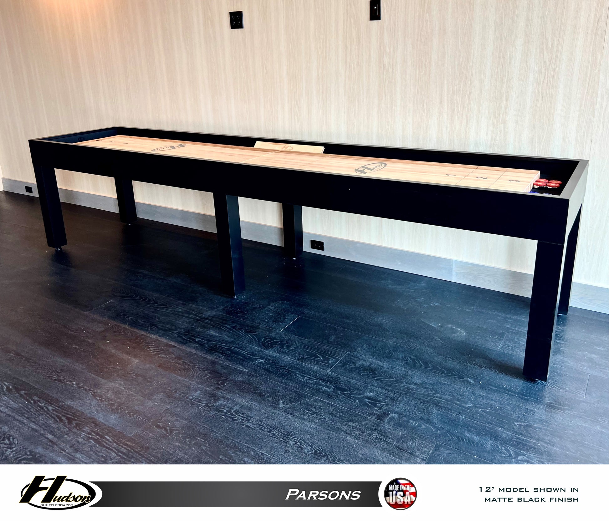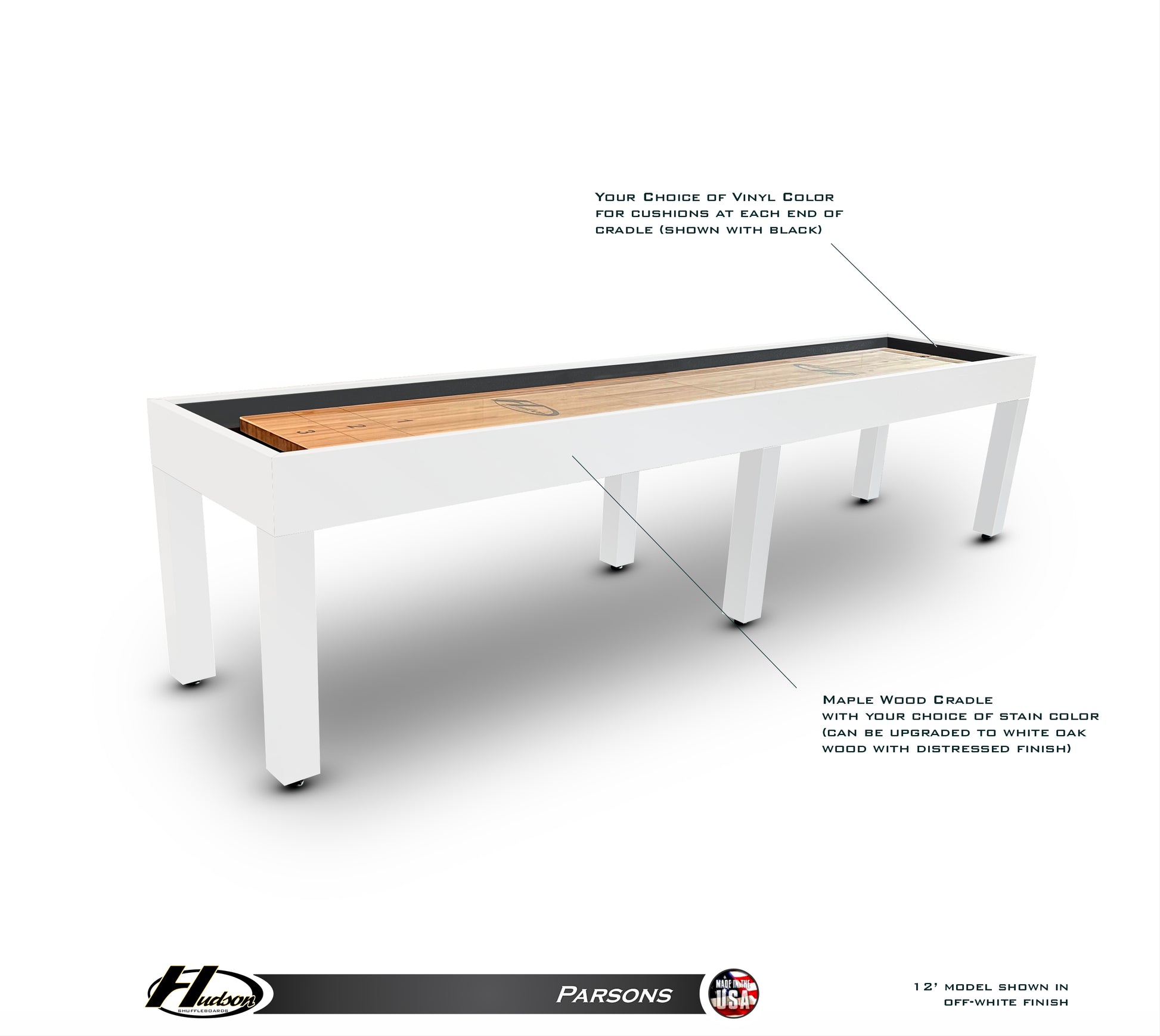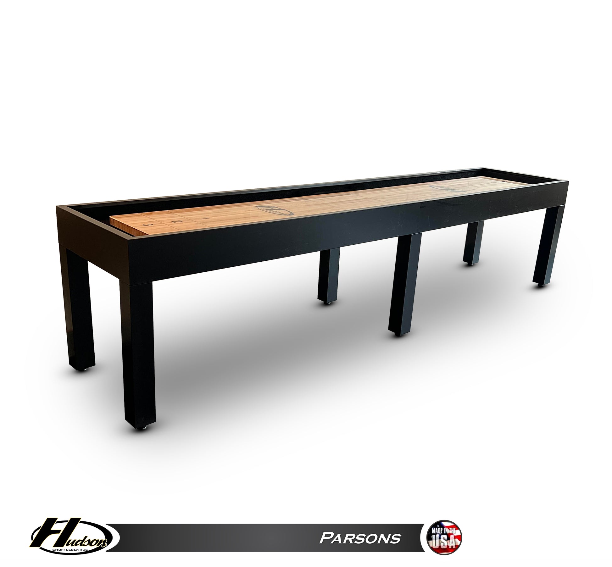 Enjoy playing shuffleboard on a cleanly designed Parsons Shuffleboard by Hudson Shuffleboards. Available sizes are 9, 10', 11', 12', 14', 16', 18', 20', or 22' (tournament size).