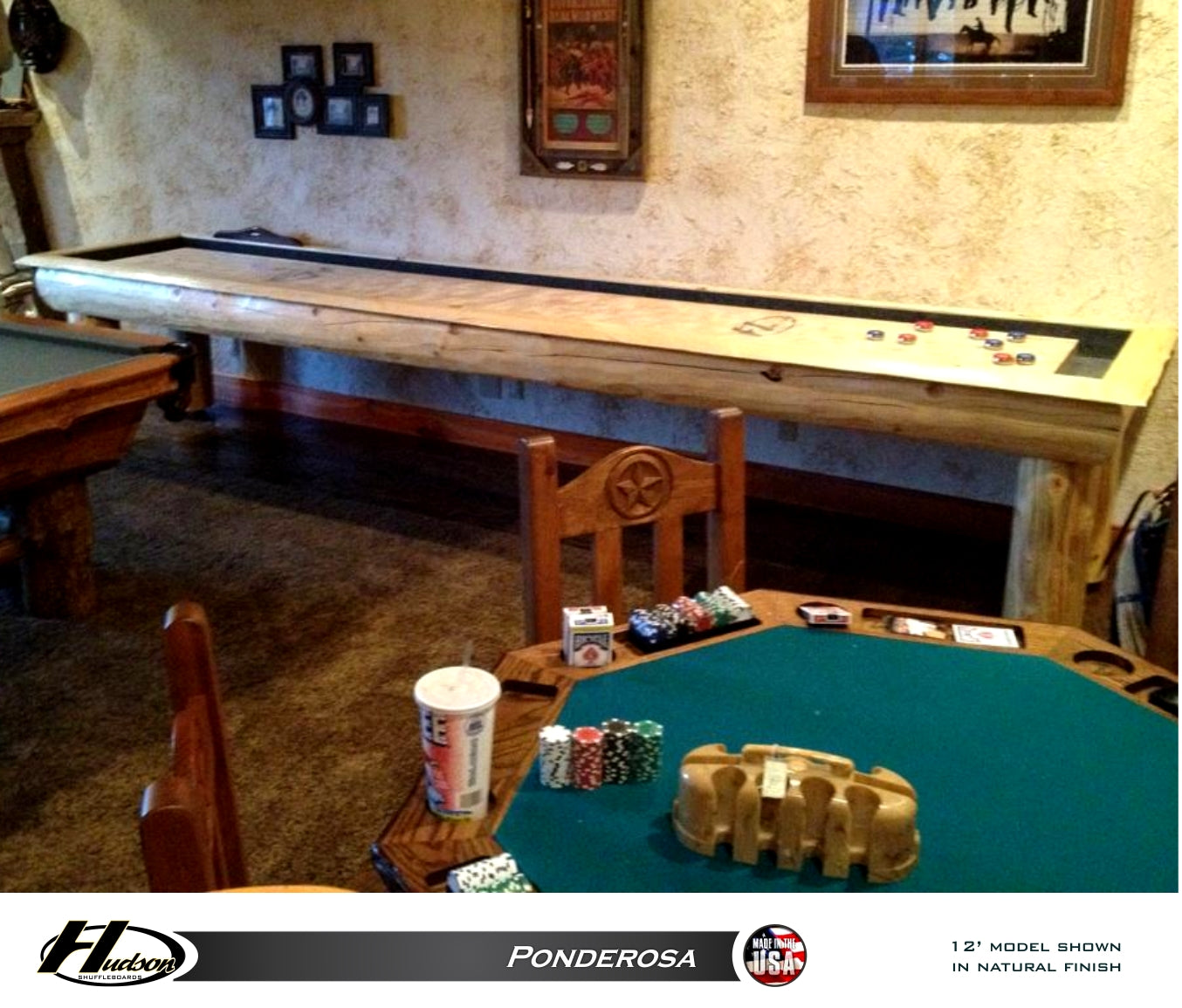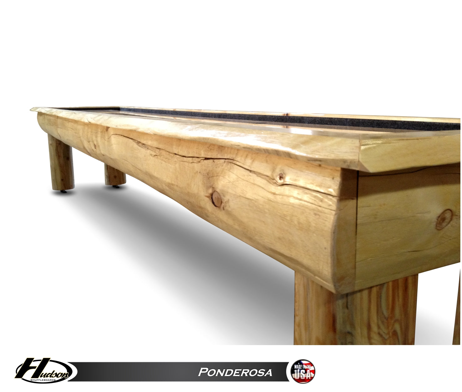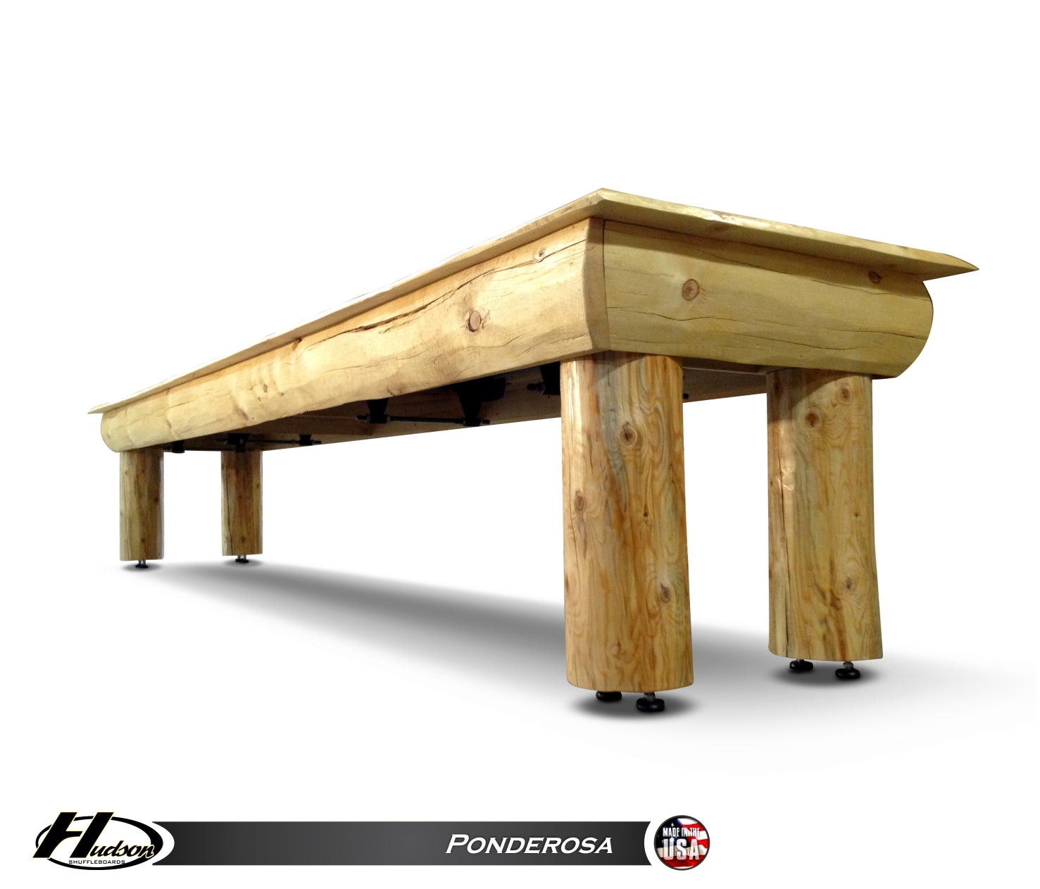 New from Hudson Shuffleboards, the Ponderosa log shuffleboard table is the ultimate in rustic shuffleboards. Made to order, the Ponderosa is constructed of 9" diameter solid kiln-dried knotty pine and a can be finished in custom stains. The playing surface is constructed of select kiln-dried Hard Rock Maple and topped with our Polymer Finish (lifetime warranty). This is the same finish insisted upon by the Professionals in tournament play. And to help keep the playing surface true, climatic adjusters are included.