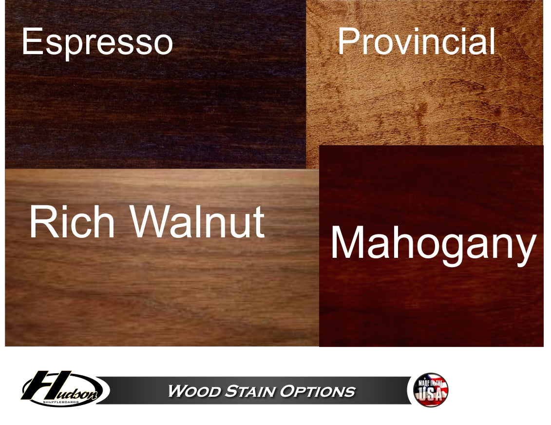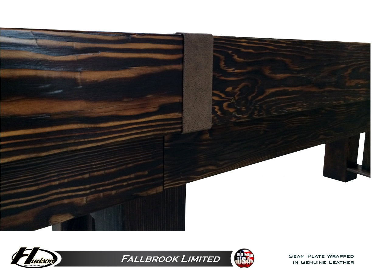 New from Hudson Shuffleboards, the Fallbrook Limited Shuffleboard features a rustic look with hand-distressed legs and cradle. The interior walls of the horsecollars are wrapped in your color choice of genuine leather. Constructed entirely of solid kiln dried wood (no veneers), this newest addition to our collection is sure to be the showpiece in any room. This table is made to order and a can be finished in Espresso, Provincial, Mahogany, or Rich Walnut stains. The playing surface is constructed of select kiln-dried Hard Rock Maple and topped with our Polymer Finish (lifetime warranty). This is the same finish insisted upon by the Professionals in tournament play. And to help keep the playing surface true, climatic adjusters are included.