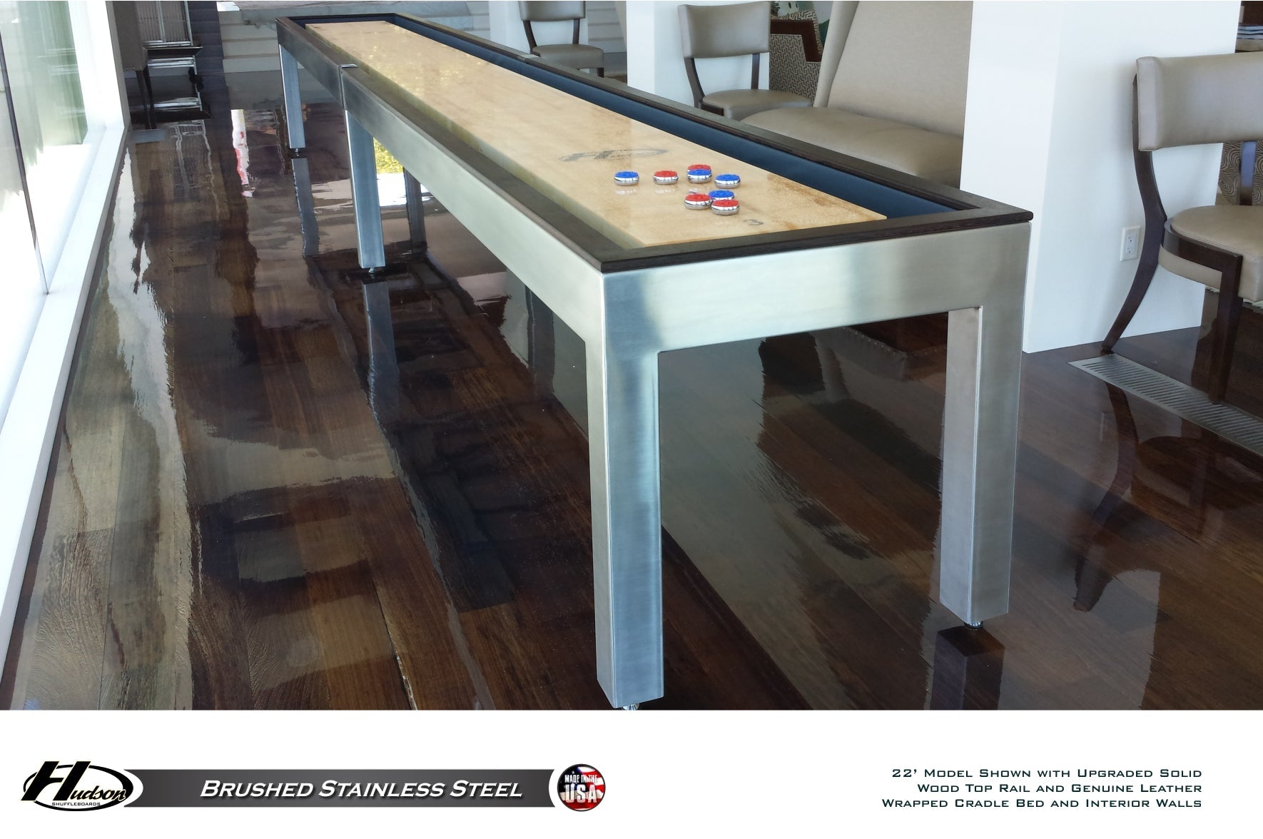 Enjoy playing shuffleboard on a newly designed Brushed Stainless Steel Shuffleboard by Hudson Shuffleboards. Available sizes are 9, 12', 14', 16', 18', 20', or 22' (tournament size).