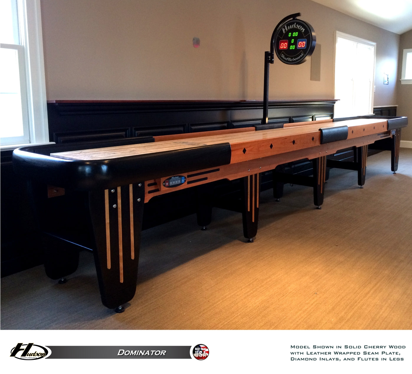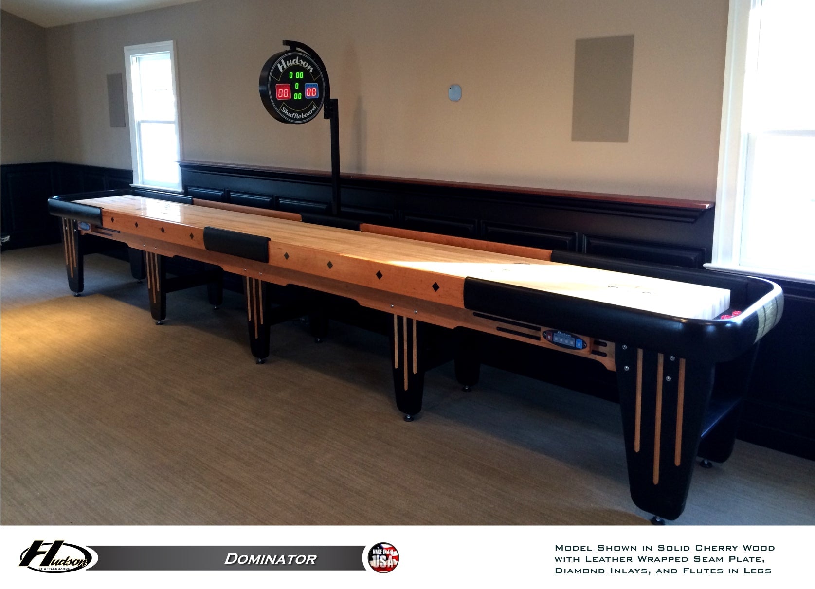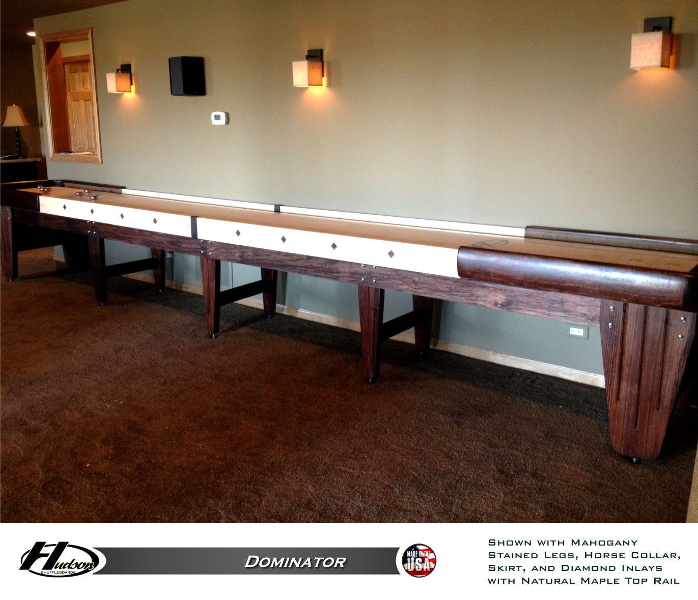 Hudson Shuffleboards is proud to offer the finest shuffleboard on the market today, the Dominator. Sparing no costs for quality, each Dominator is entirely constructed of solid wood and made to order using the finest hard woods available. These woods include cedar, walnut, oak, maple, cherry, mahogany, and poplar. The Dominator is the ONLY shuffleboard that features a 5-piece horsecollar milled out of single pieces of wood as opposed to adding additional trim pieces on the top. Custom stains and exotic woods are also available upon request. Available in 9', 12', 14', 16', 18', 20', and 22' lengths.