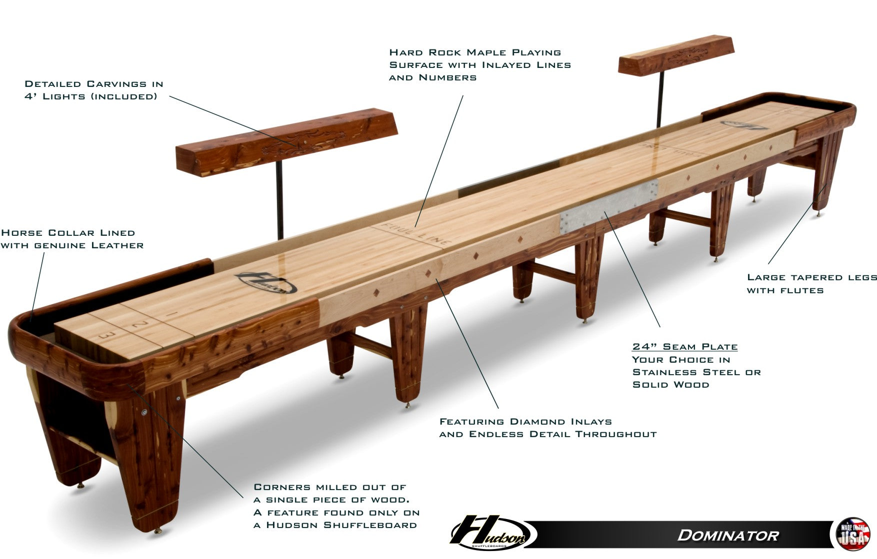 The Dominator features diamond inlays highlighting the cradle, genuine leather lining the horse collar, and decorative carvings throughout the legs and lights. The seam-plate is available in stainless steel (as shown above) or solid wood. The playing surface is constructed of Select kiln dried Hard-Rock Maple and topped with our Polymer Finish (lifetime warranty).