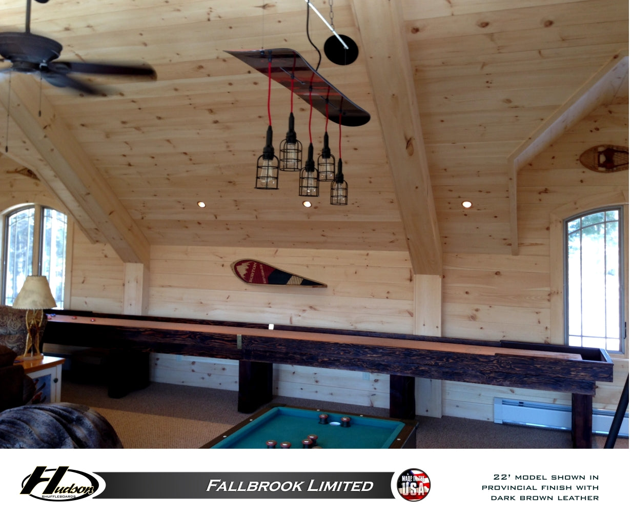 New from Hudson Shuffleboards, the Fallbrook Limited Shuffleboard features a rustic look with hand-distressed legs and cradle. The interior walls of the horsecollars are wrapped in your color choice of genuine leather. Constructed entirely of solid kiln dried wood (no veneers), this newest addition to our collection is sure to be the showpiece in any room. This table is made to order and a can be finished in Espresso, Provincial, Mahogany, or Rich Walnut stains. The playing surface is constructed of select kiln-dried Hard Rock Maple and topped with our Polymer Finish (lifetime warranty). This is the same finish insisted upon by the Professionals in tournament play. And to help keep the playing surface true, climatic adjusters are included.
