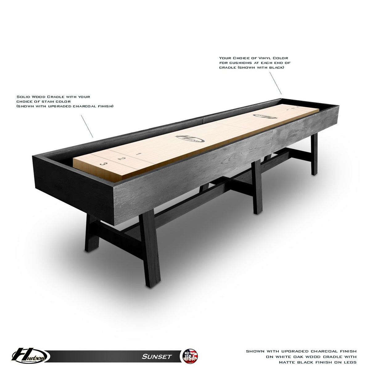 Enjoy playing shuffleboard on a cleanly designed Sunset Shuffleboard by Hudson Shuffleboards. Available sizes are 9, 10', 11', 12', 14', 16', 18', 20', or 22' (tournament size).