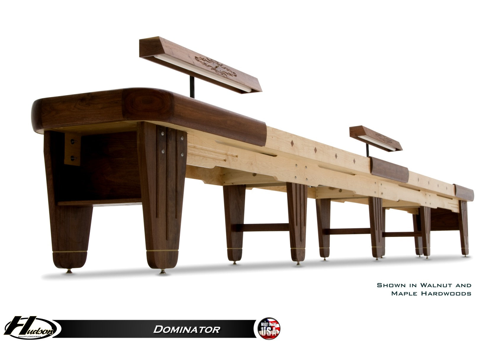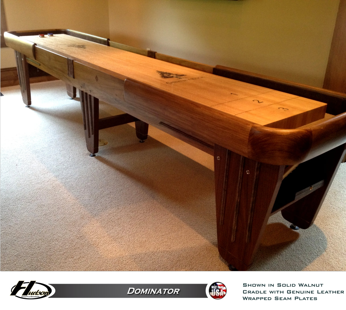 Hudson Shuffleboards is proud to offer the finest shuffleboard on the market today, the Dominator. Sparing no costs for quality, each Dominator is entirely constructed of solid wood and made to order using the finest hard woods available. These woods include cedar, walnut, oak, maple, cherry, mahogany, and poplar. The Dominator is the ONLY shuffleboard that features a 5-piece horsecollar milled out of single pieces of wood as opposed to adding additional trim pieces on the top. Custom stains and exotic woods are also available upon request. Available in 9', 12', 14', 16', 18', 20', and 22' lengths.