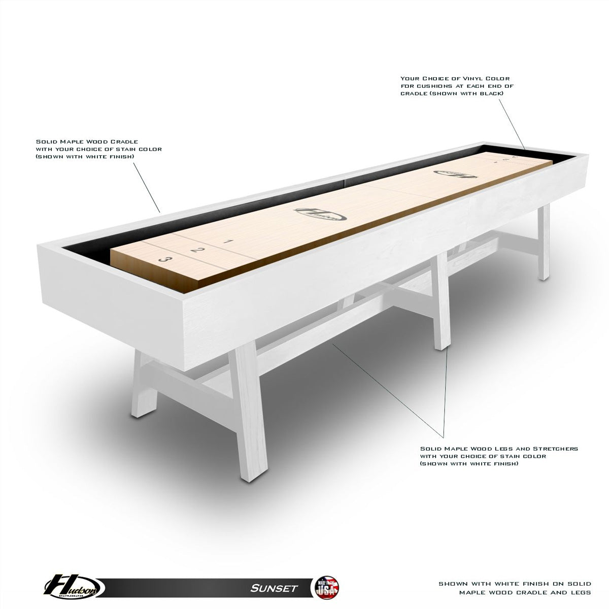Enjoy playing shuffleboard on a cleanly designed Sunset Shuffleboard by Hudson Shuffleboards. Available sizes are 9, 10', 11', 12', 14', 16', 18', 20', or 22' (tournament size).
