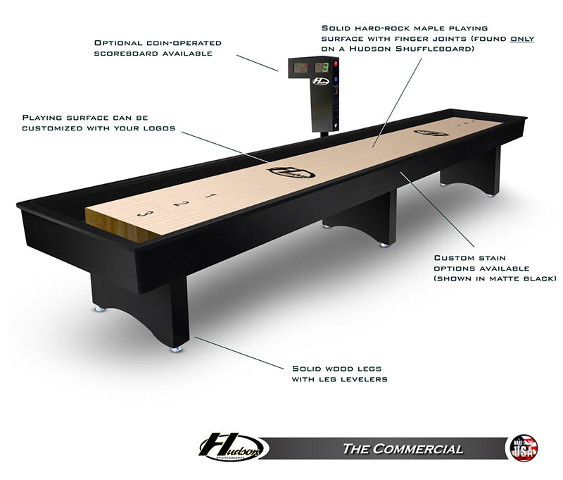 Join the Pros and enjoy playing shuffleboard on a newly designed Commercial Shuffleboard by Hudson Shuffleboards. Available sizes are 9, 12', 14', 16', 18', 20', or 22' (tournament size).
