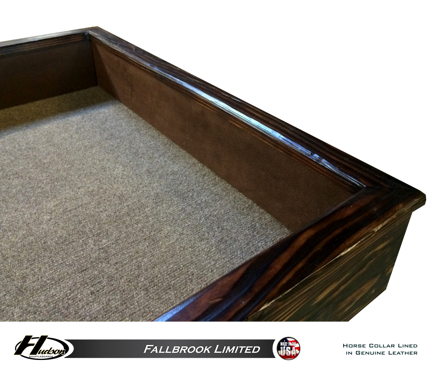 New from Hudson Shuffleboards, the Fallbrook Limited Shuffleboard features a rustic look with hand-distressed legs and cradle. The interior walls of the horsecollars are wrapped in your color choice of genuine leather. Constructed entirely of solid kiln dried wood (no veneers), this newest addition to our collection is sure to be the showpiece in any room. This table is made to order and a can be finished in Espresso, Provincial, Mahogany, or Rich Walnut stains. The playing surface is constructed of select kiln-dried Hard Rock Maple and topped with our Polymer Finish (lifetime warranty). This is the same finish insisted upon by the Professionals in tournament play. And to help keep the playing surface true, climatic adjusters are included.