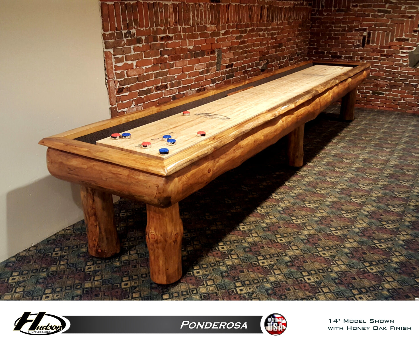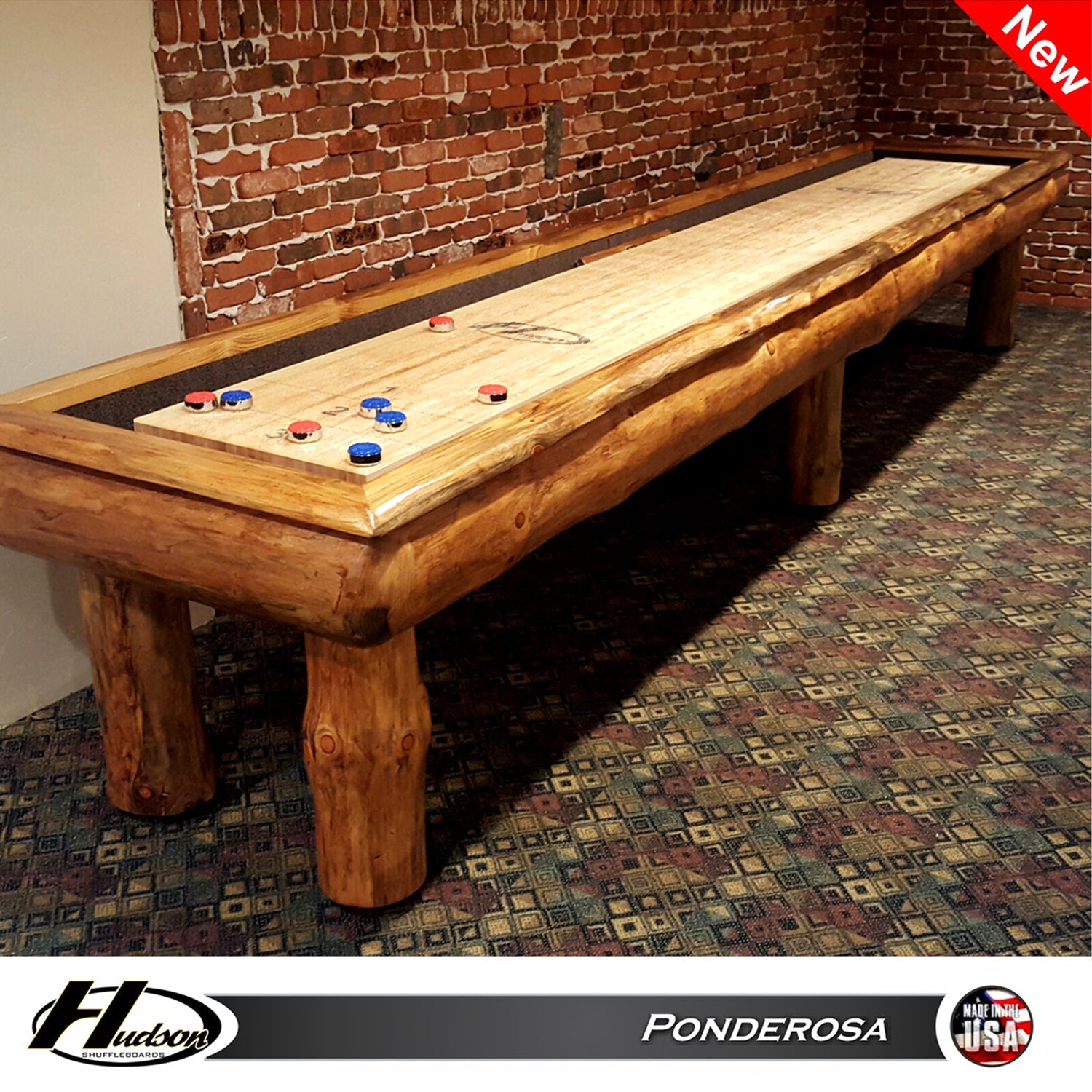 New from Hudson Shuffleboards, the Ponderosa log shuffleboard table is the ultimate in rustic shuffleboards. Made to order, the Ponderosa is constructed of 9" diameter solid kiln-dried knotty pine and a can be finished in custom stains. The playing surface is constructed of select kiln-dried Hard Rock Maple and topped with our Polymer Finish (lifetime warranty). This is the same finish insisted upon by the Professionals in tournament play. And to help keep the playing surface true, climatic adjusters are included.