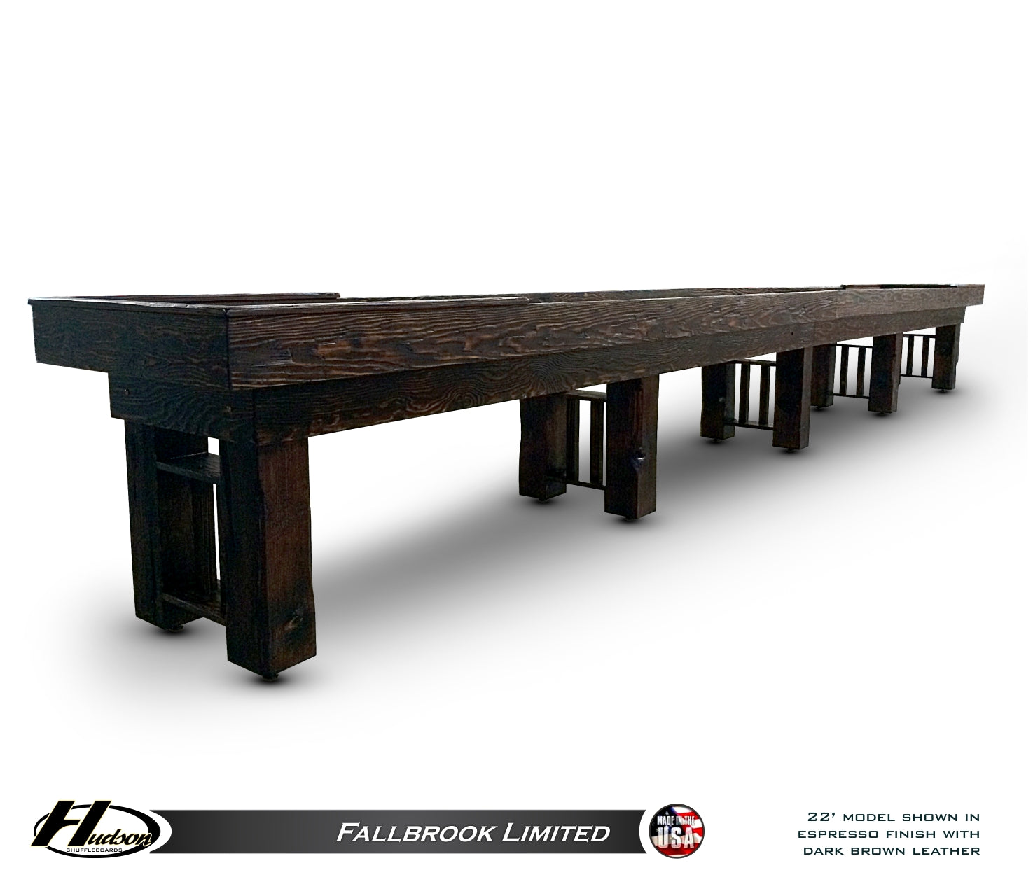 New from Hudson Shuffleboards, the Fallbrook Limited Shuffleboard features a rustic look with hand-distressed legs and cradle. The interior walls of the horsecollars are wrapped in your color choice of genuine leather. Constructed entirely of solid kiln dried wood (no veneers), this newest addition to our collection is sure to be the showpiece in any room. This table is made to order and a can be finished in Espresso, Provincial, Mahogany, or Rich Walnut stains. The playing surface is constructed of select kiln-dried Hard Rock Maple and topped with our Polymer Finish (lifetime warranty). This is the same finish insisted upon by the Professionals in tournament play. And to help keep the playing surface true, climatic adjusters are included.