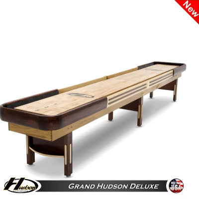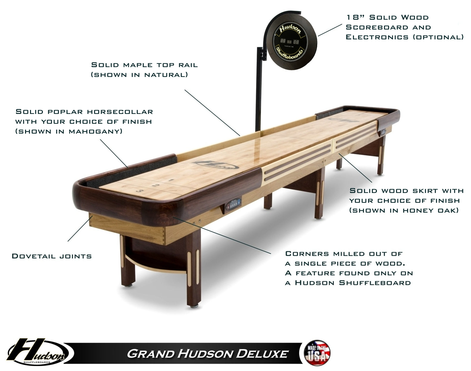 Join the Pros and enjoy playing shuffleboard on a beautifully designed Grand Hudson Deluxe Shuffleboard. Available sizes are 9, 12', 14', 16', 18', 20', or 22' (tournament size).