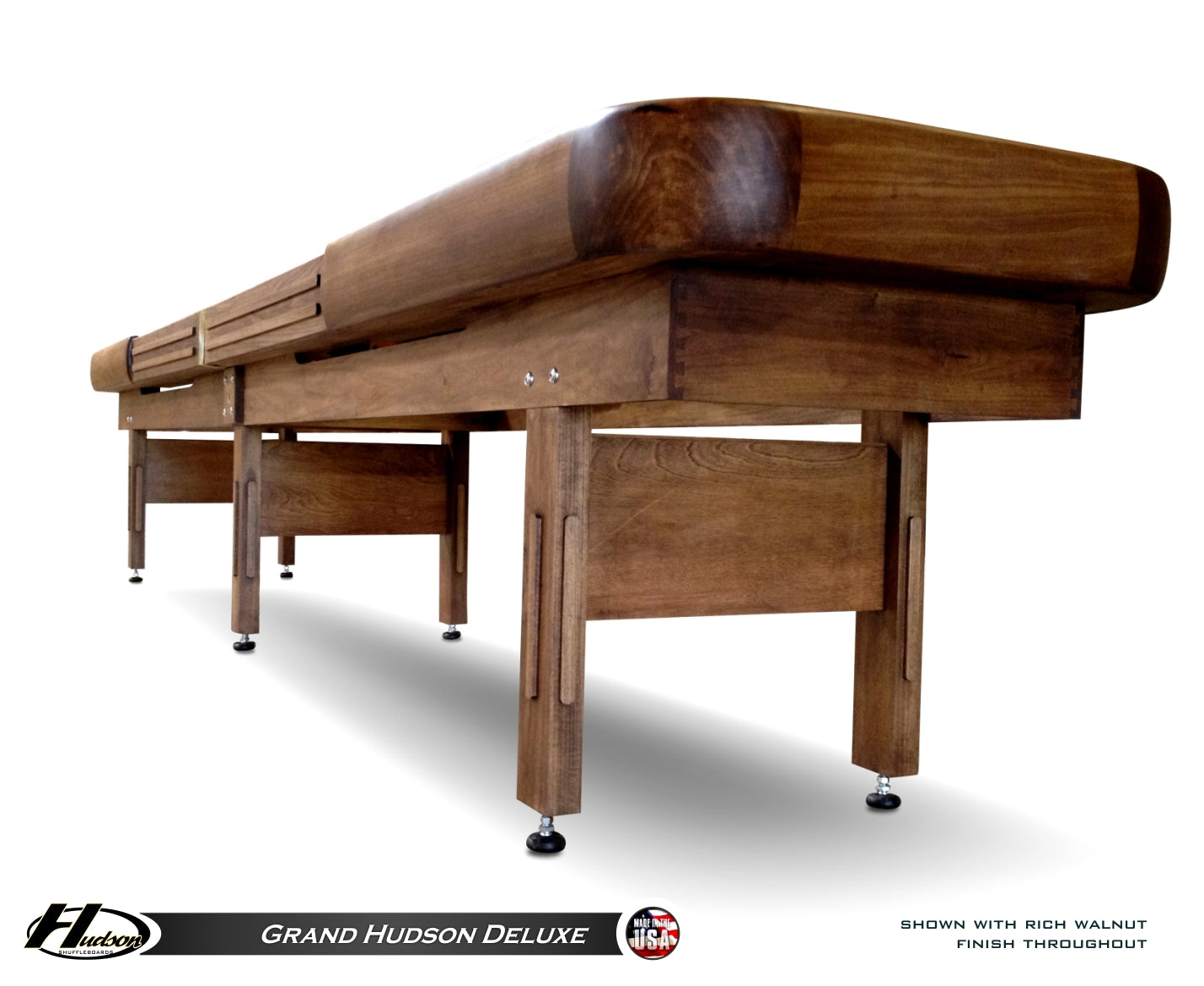 New from Hudson Shuffleboards! The Grand Hudson Deluxe Shuffleboard is a beautiful work of master craftsmanship that features a timeless American look and made right here in the USA! The cradle on this Grand Hudson Deluxe is constructed of Solid Poplar and Hard-Rock Maple Hardwoods and finished with your choice of stain(s). In addition, each corner on the horsecollar is milled out of single piece of solid wood, a touch you won't find on ANY other shuffleboard. Sparing no costs for quality, the 3” thick playing surface is constructed of select kiln-dried Hard-Rock Maple and topped with our Polymer Finish (lifetime warranty), which is the clearest Polymer on the market poured only by the best in the industry. This is the same finish insisted upon by the Professionals in tournament play.