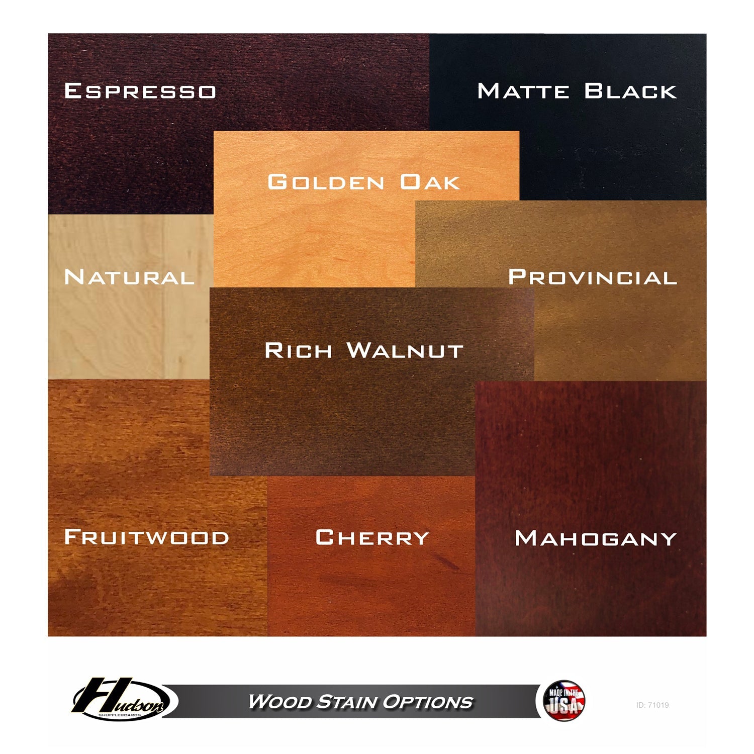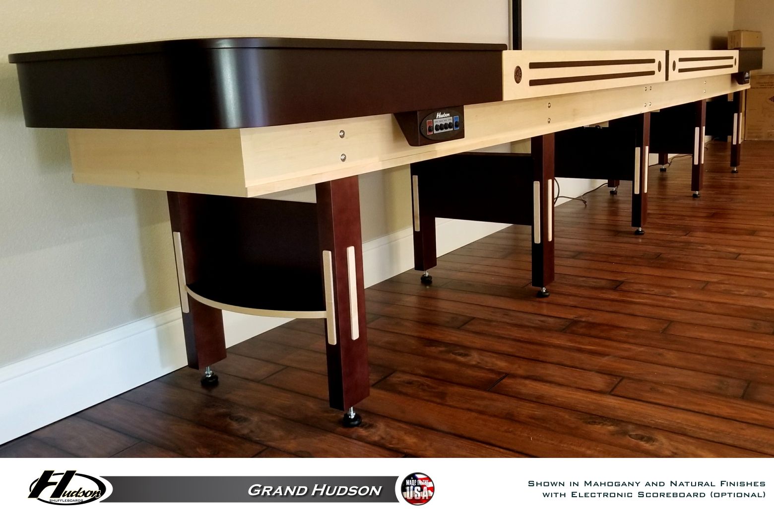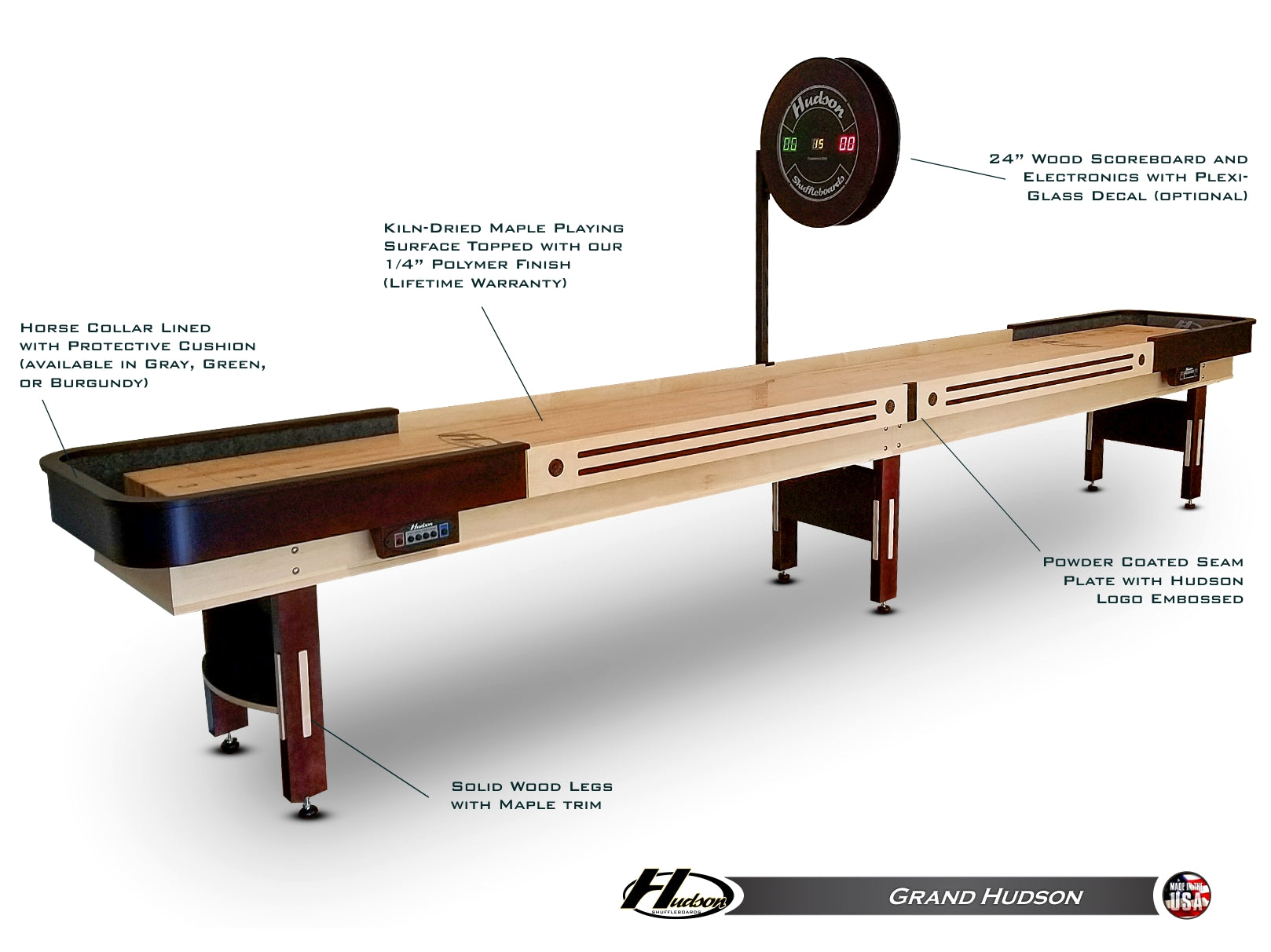Quality…Affordable…Fun! The newly redesigned Grand Hudson Shuffleboard is a beautiful work of master craftsmanship that features a timeless American look made 100% in the USA. The legs on the Grand Hudson are constructed using solid maple hardwood and select veneer for the cradle, all of which can be finished with your choice of stain(s). Sparing no costs for quality, the 3” thick playing surface is constructed of select kiln-dried Maple and topped with our Polymer Finish (lifetime warranty). This is the same finish insisted upon by the Professionals in tournament play. And to help keep the playing surface true, climatic adjusters are included.