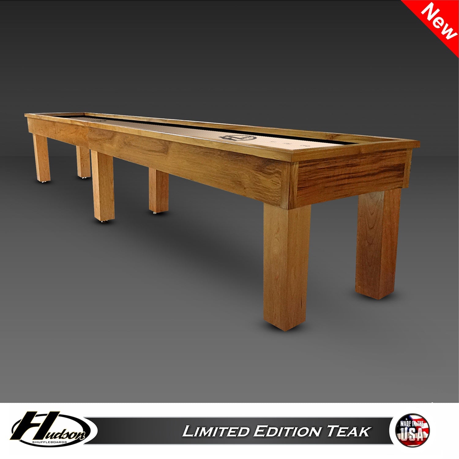 Handcrafted from top-quality solid teak, a fine-grained hardwood that is rich in natural oils and prized for its beauty, strength and moisture resistance, the Limited Edition Teak shuffleboard features sleek lines and a warm natural finish.