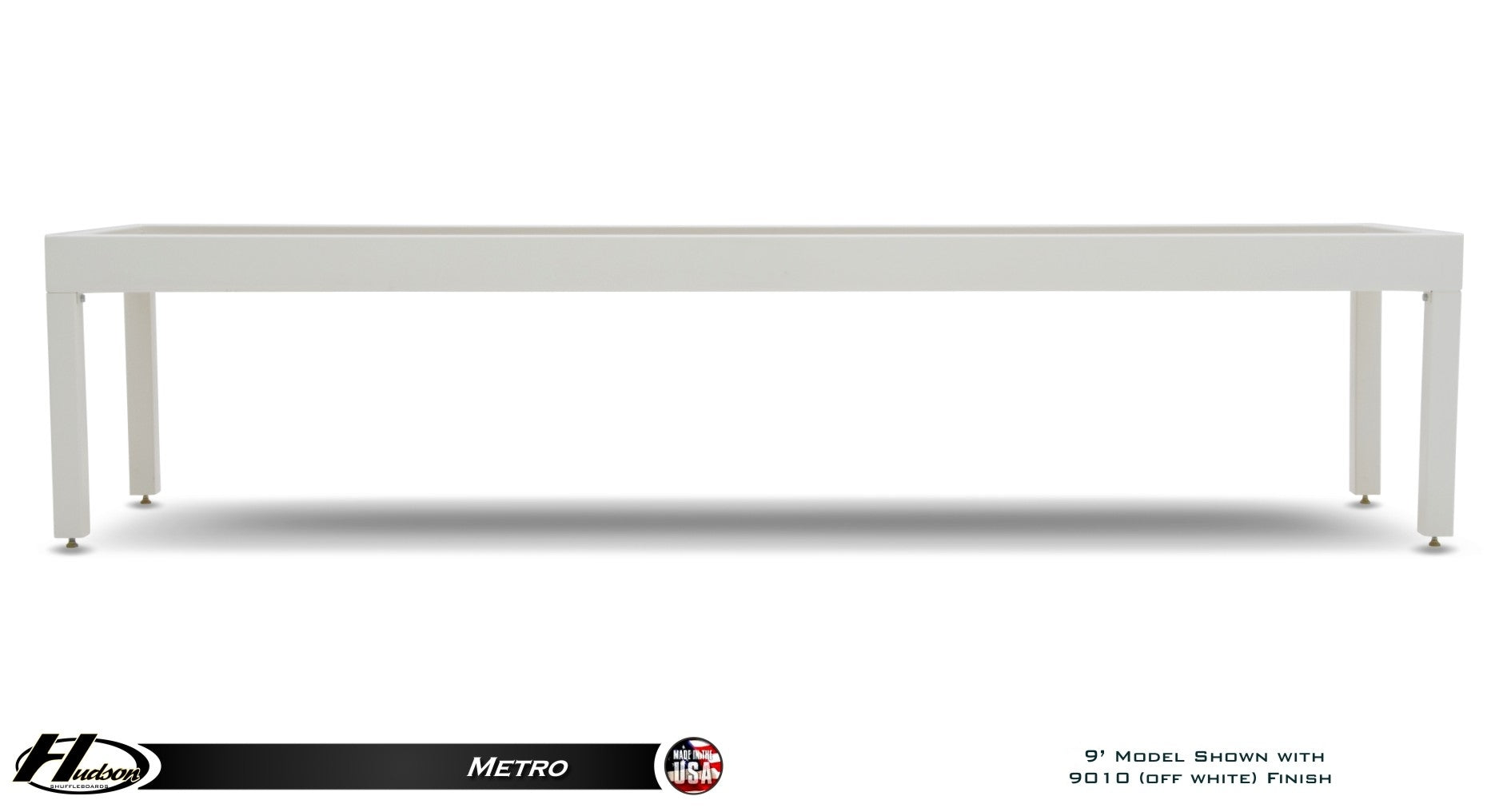 Contemporary…Sleek…Quality! New from Hudson Shuffleboards, the Metro is a sleek and contemporary design that brings shuffleboard into the new era. Made to order and constructed of powder-coated steel, the cradle can be finished in any color shown on our color chart. To add a clean touch, the inside walls of the cradle are lined with a vinyl wrapped cushion. Select a vinyl to match the powder coat color or choose from our other options below. The playing surface and carpet on the Metro can also be upgraded to all-weather for outdoor use which now includes your choice of color for our Sunbrella table cover.
