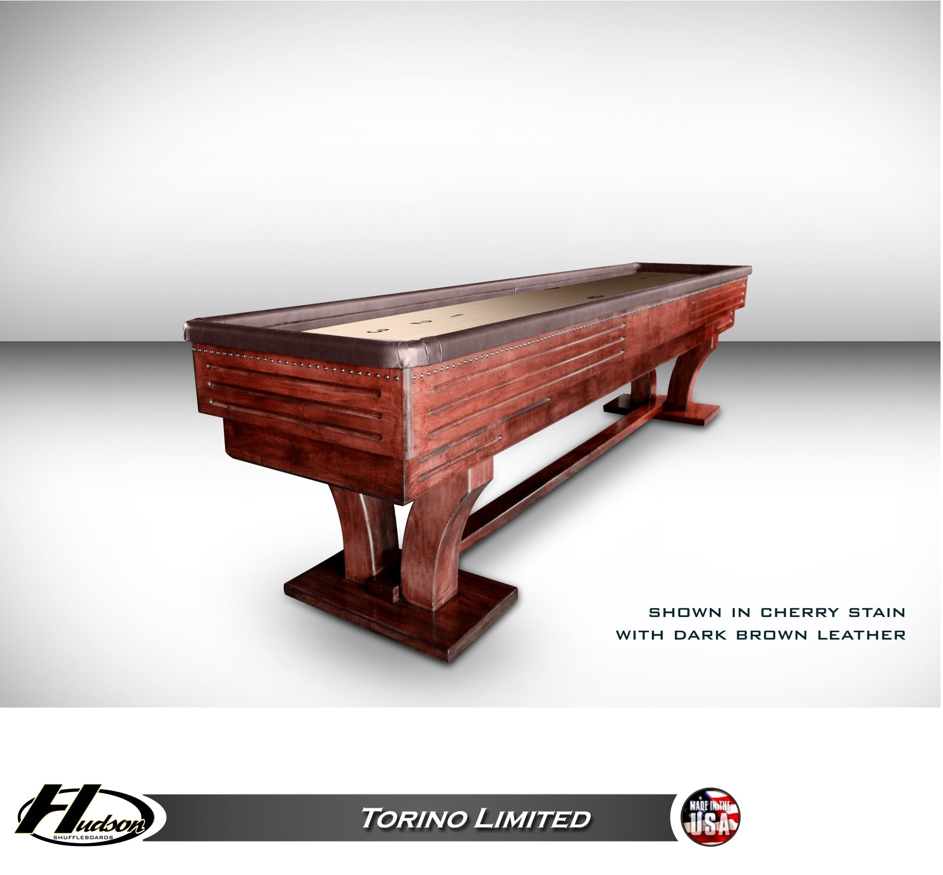 New from Hudson Shuffleboards, the Torino Limited Shuffleboard features a contemporary look with classic lines. Constructed entirely of Solid Maple (no veneers), this newest addition to our collection is sure to be the centerpiece in any room. This classic, yet modern design features elegant legs, brass nail heads, and a top rail wrapped with your choice of genuine leather. This table is made to order and a can be finished in Matte Black, Espresso, Provincial, Golden Oak, Rich Walnut, Fruitwood, Mahogany, Cherry, or Natural Finish Stains. Or we can also match any custom stain you provide. The playing surface is constructed of select kiln-dried Hard Rock Maple and topped with our Polymer Finish (lifetime warranty). This is the same finish insisted upon by the Professionals in tournament play. And to help keep the playing surface true, climatic adjusters are included.